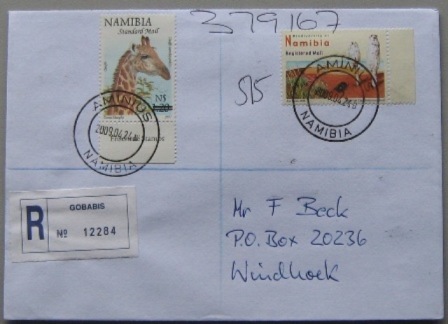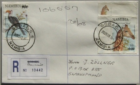 | Poststempel   Ab 15.08.2008 wurde der Stempel Gobabis 6 verwendet. Ein eigener Stahlstempel mit der falschen Inschrift Aminius wurde ausgeliefert (WPS 02/09)-der berichtigte "Aminuis" Stempel wurde am 24.07.2009 eingesetzt.  |