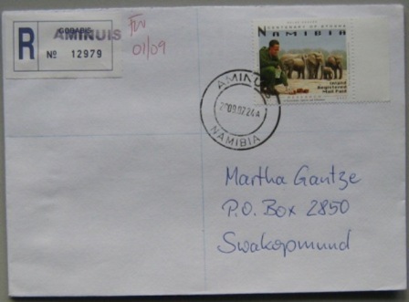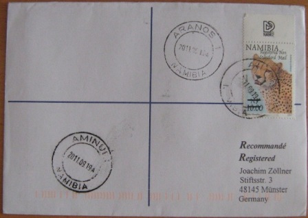| "Falscher Stempel" Aminius - 2009.04.24, Rückseite Windhoek MLPG 2 | "Richtiger Stempel" Aminuis - 2009.07.24 (hds.01.09.), Rückseite Gobabis, Windhoek MLPG 2, Swakopmund |