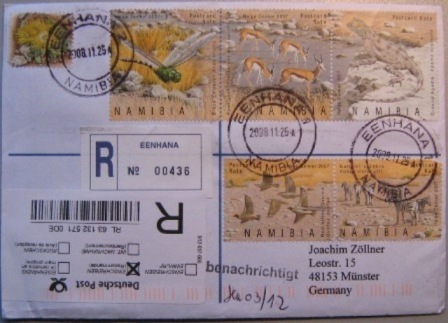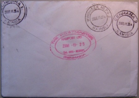 | Eenhana 1 - 2008.11.25 Rückseite: Eenhana 1, Windhoek MLPG 2, Postmastercachet  |