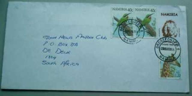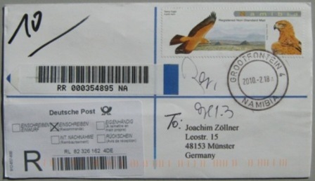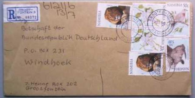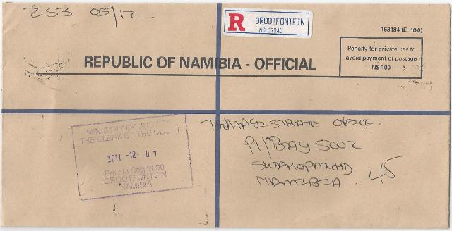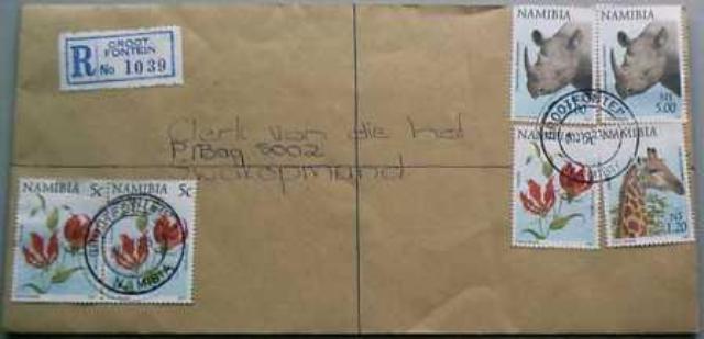 Grootfontein 4 - 2010-2-18 Rückseite: Grootfontein 5,Controll Postmaster GFTN Area Windhoek MLPG 2  |