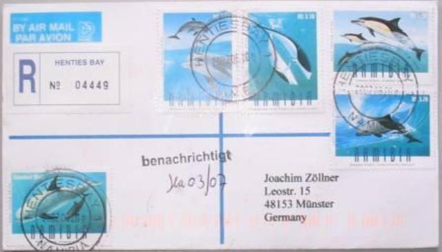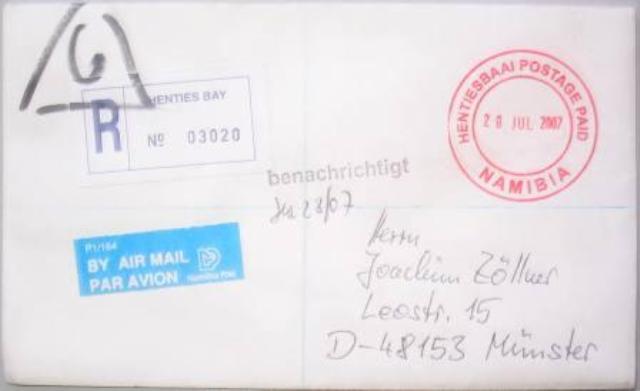 | Hentiesbaai Postage Paid 20 Jul 2007 Rückseite: Hentiesbay 1, Windhoek MLPG 2  |