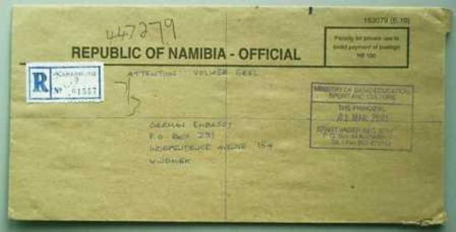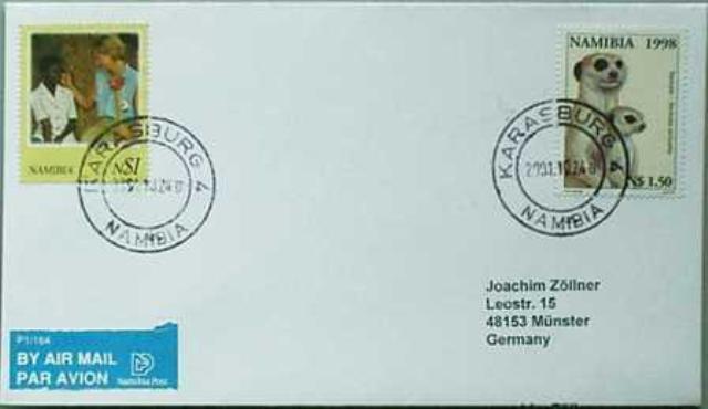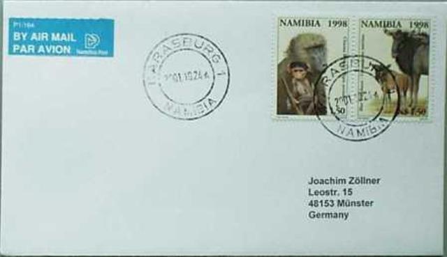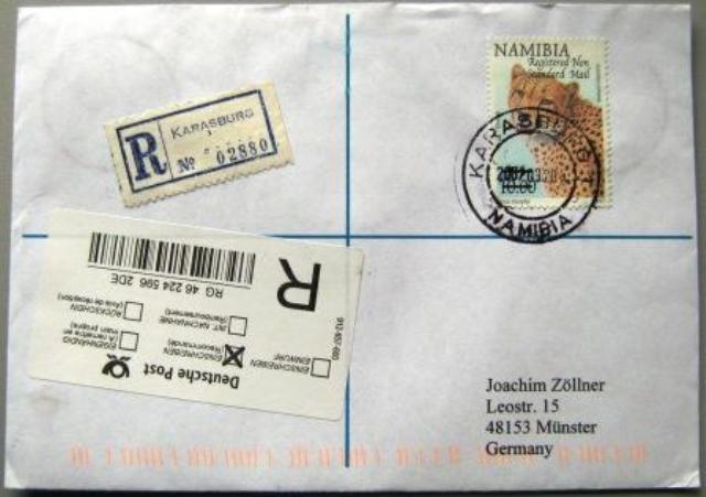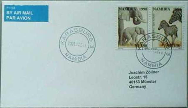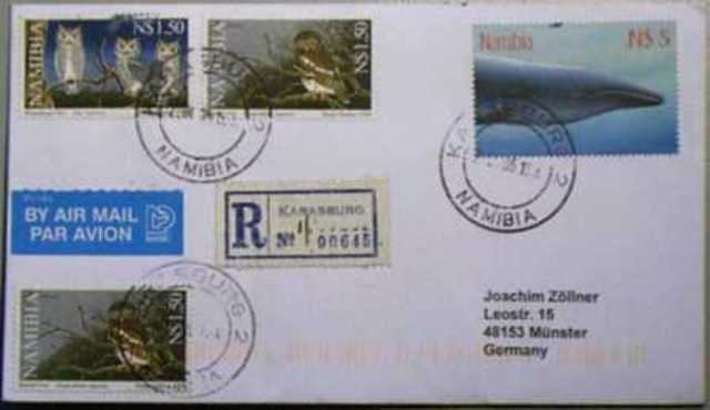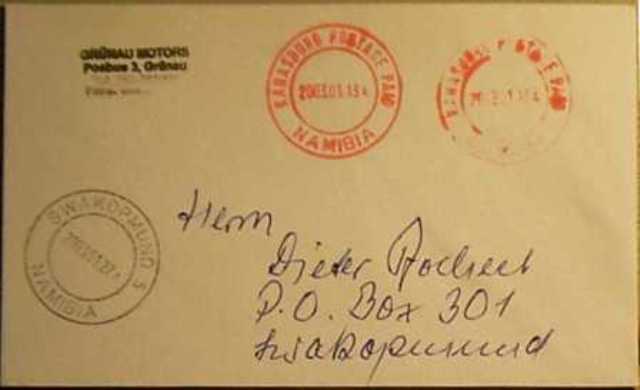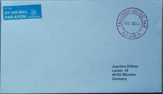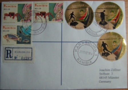 Karasburg Postage Paid - 2003.01.13-A on front: Swakopmund 5 - 2003.01.17 A  |