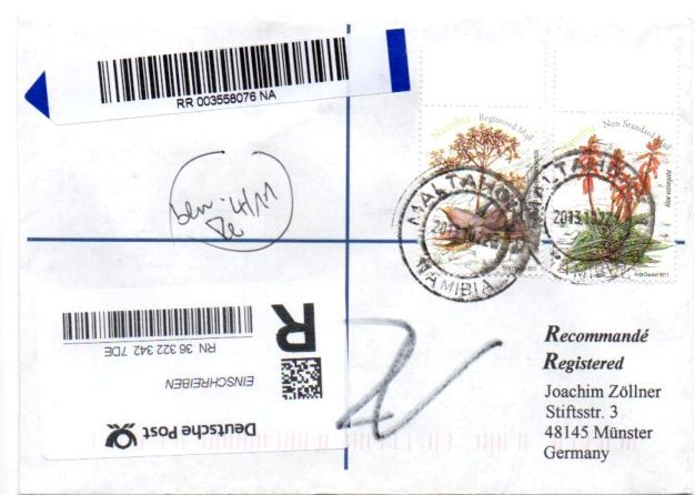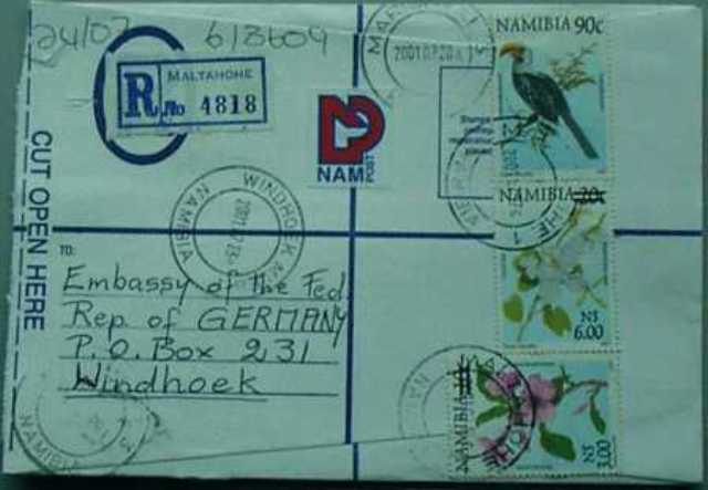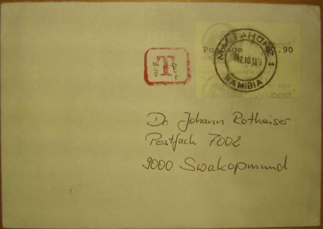 Maltahöhe 11.10.2012 mit Postage Lablel und Tax Stempel  |