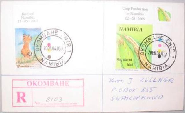 Okombahe verwendete ab dem 07.07.2000 bis zum 22.04.2006 als Counter Point den Stempel Omaruru 4 (05/00 WPS). Der eigene Stempel wird regulär seit dem 23.04.2006 verwendet, es gibt aber "philatelistische" Ersttagsbriefe vom 05.04.2006.  |