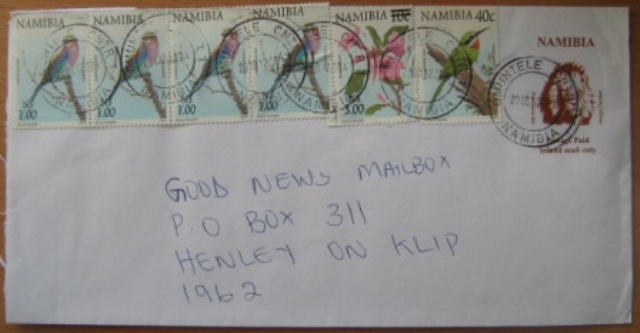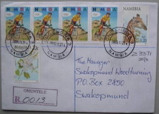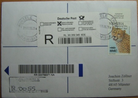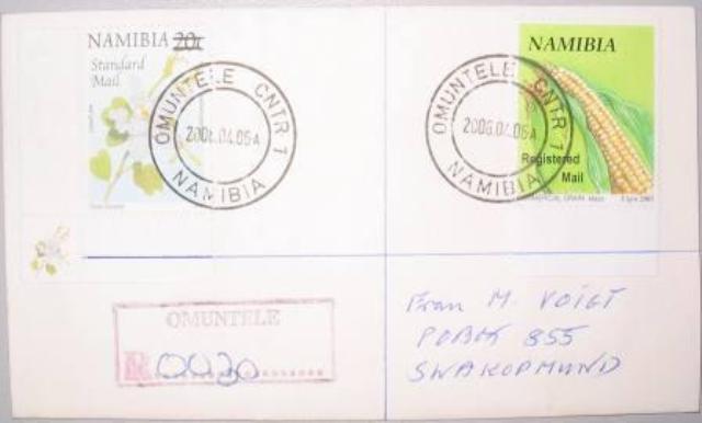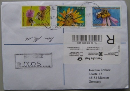 | Omuntele Cntr 1 - 2011.06.21 Auf Rückseite: mehrere Omuntele Stempel, kein Windhoek Stempel, Echt gelaufen, siehe R-Zettel Deutschland  |