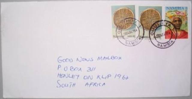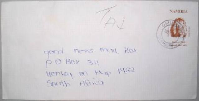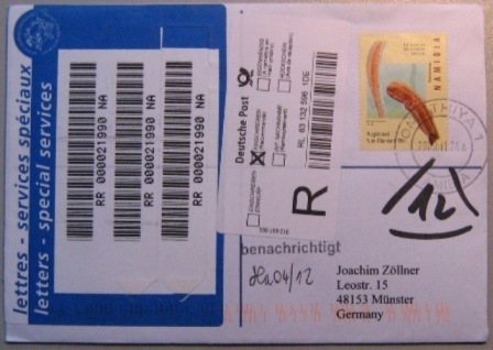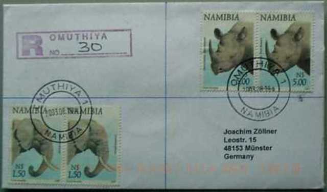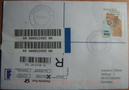 | Omuthiya 1 - 2008.11.24, mit UPU R-Lable Rückseite: Windhoek MLPG 2, innenliegend Postmastercachet  |