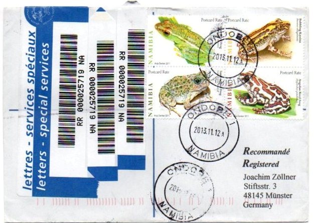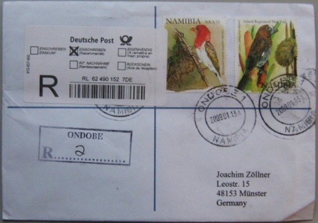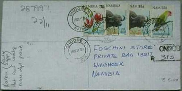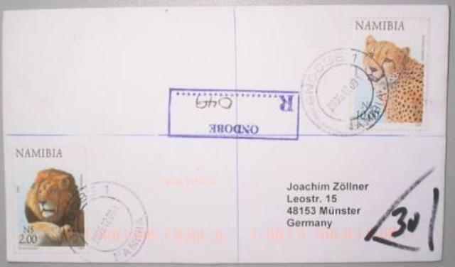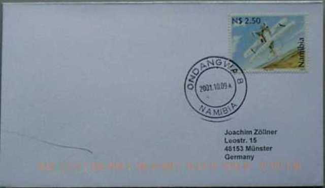 Ondobe 1 (125/00) - wurde im Jahr 2002 letztmalig verwendet, genaues Datum ist nicht bekannt ( WSP 05/02 ) ? Ondobe hat vom 10.10.2001 (andere Quelle 01.10) bis Februar 2003 als Counter Point Ondangwa 8 verwendet. Vom Februar 2003 bis 30.10.2004 wurde der Stempel Ohangwena 3 verwendet. Am 01.11.2004 änderte sich der Status von Counter Point in Postal Agency, der Stempel Ondobe 1 wurde wieder verwendet. Fehler 08.06.2009  |