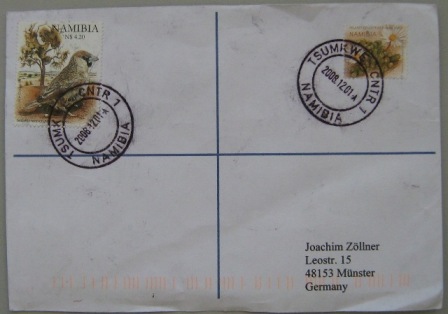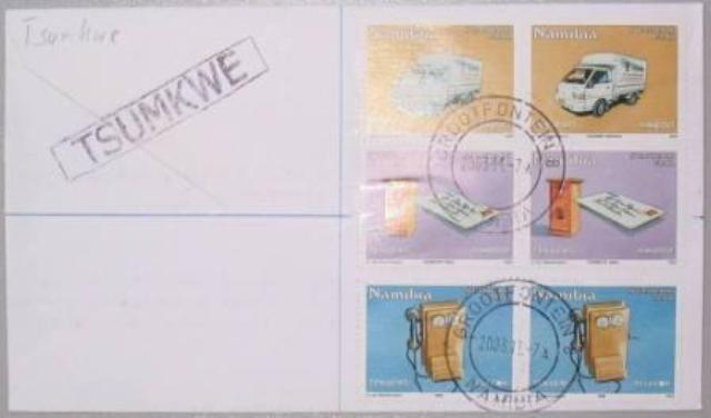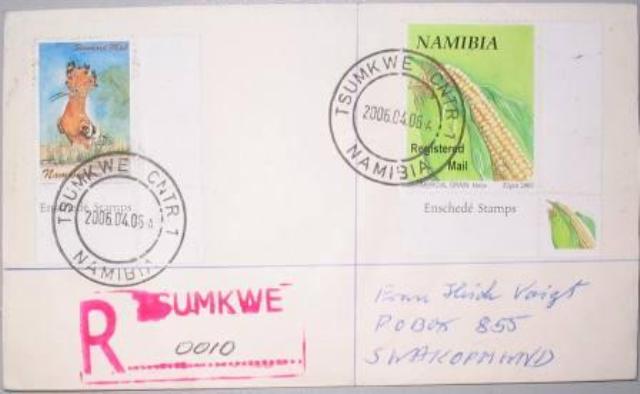Vom April 2000 bis 19.04.2006 verwendete der Counter Point Tsumkwe den Stempel Grootfontein 8 (3/00 WPS). Der eigene Stempel wird regulär seit dem 24.04.2006 verwendet, es gibt aber "philatelistische" Ersttagsbriefe vom 06.04.2006.  |