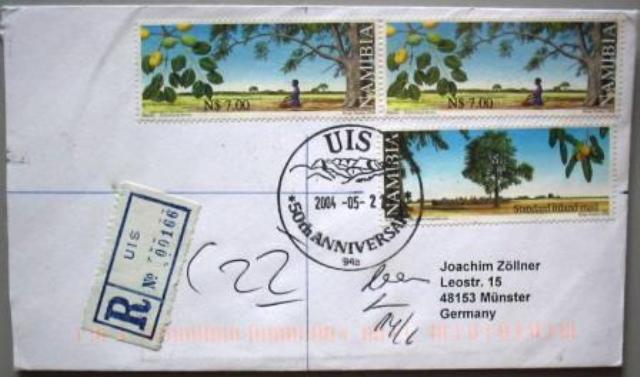Poststempel 1, 2 (162-163/00) Ab 22.05.2004 wurde ein Sonderstempel zum 50jährigen Eröffnung des Postamtes in Uis verwendet. Special Postmark "50th Anniversary"  |