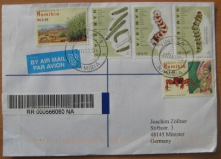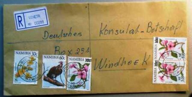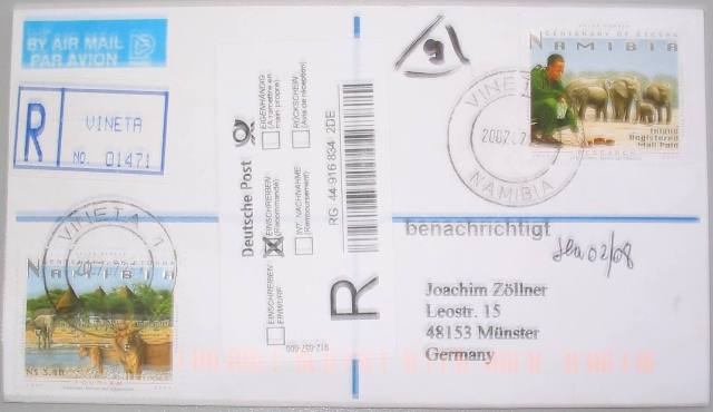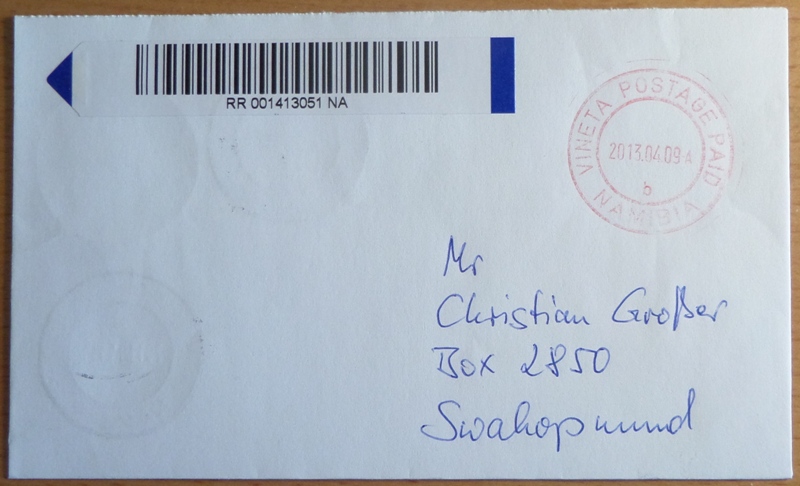 Vineta 1 - 2007.26.07. Rückseite:Vineta Postage Paid, Swakopmund 5, Windhoek MLPG 2 - Einlieferungsbeleg innenliegend  |