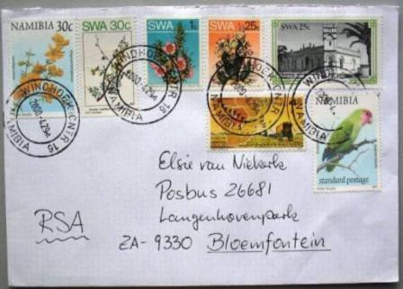 Poststempel Windhoek CNTR 1 - 19 Verwendung im Jahre 2003 (WPS 05/04) CNTR 1 - 8 an den jeweiligen Schaltern CNTR 9, 11, 12 - zeitweise an den Schaltern 1 - 8 CNTR 10 - Schalter 16 Einlieferung Einschreibebriefe CNTR 13 - Counter Point Wernhill Pick´n Pay CNTR 14, 15 - Schalter 14 bzw. 15 Einlieferung Einschreiben CNTR 16 - wurde gestohlen CNTR 17 - Schalter Information und "Bulk Mail" CNTR 18 - Internationale Post CNTR 19 - Telegraphenamt Postage Paid Head Office 1 und 2  |