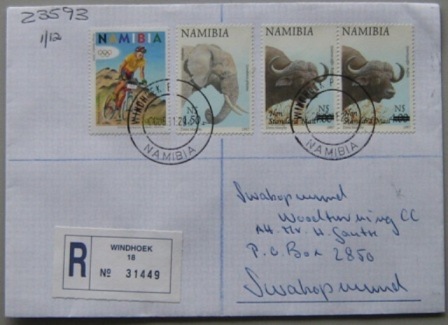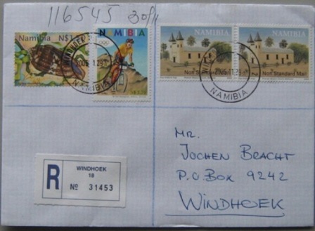 Für den philatelistischen Dienst gab es 5 Stempel Windhoek Philately 1, 2, 4 und 5, zusätzlich wurde der Stempel Windhoek 3 für den philatelistischen Dienst verwendet. Am 07.10.2003 wurden die Stempel aptiert, die Buchstaben "ilately" wurden entfernt. Die 4 Stempel sind als Provisorien für zukünftige Neueröffnungen gedacht. Windhoek P 1 wurde vom 01.12.2004 an im Counter Point Otjuimuse verwendet. Windhoek P 4 wird seit Januar 2007 im Stamp Shop Levinson Arcade verwendet. Windhoek P 5 wird im Hauptpostamt Windhoek an verschiedenen Schalter verwendet.  |